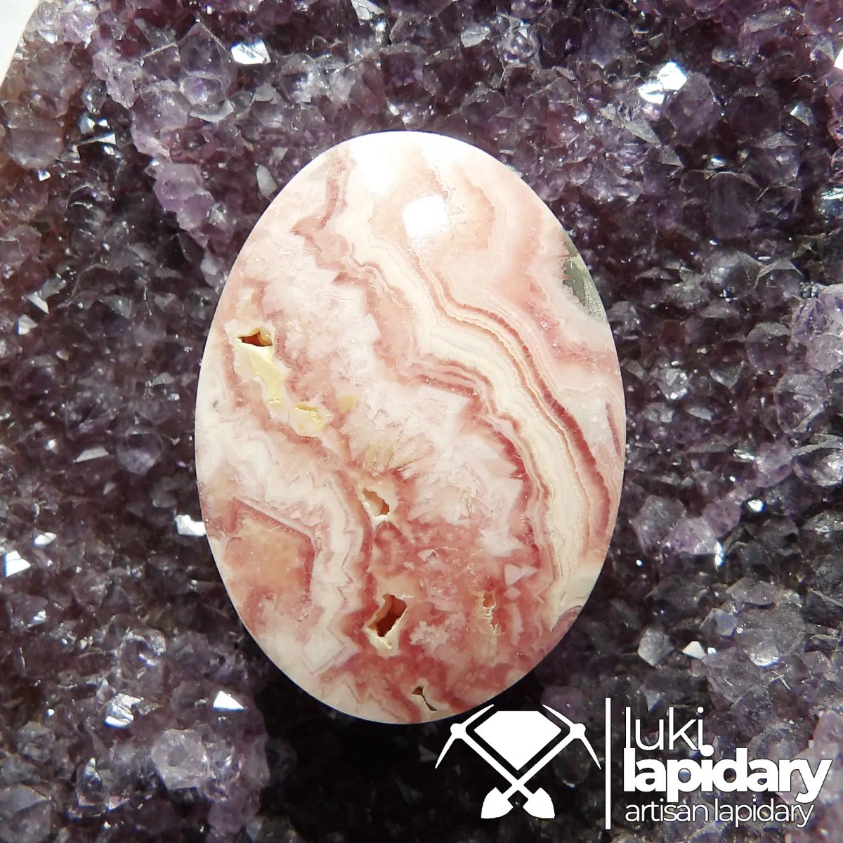 This oval-shaped rhodochrosite cabochon features vibrant pink and white veining throughout the stone. These stunning colors and intricate patterns add to the visual appeal of the stone, making it perfect for high-quality custom jewelry designs. The natural vug in the stone further enhances its charm, offering unique features that sets it apart from other gemstones. This cabochon, like all of our other cabochons, was cut, shaped, and polished in our lapidary shop in Ohio.