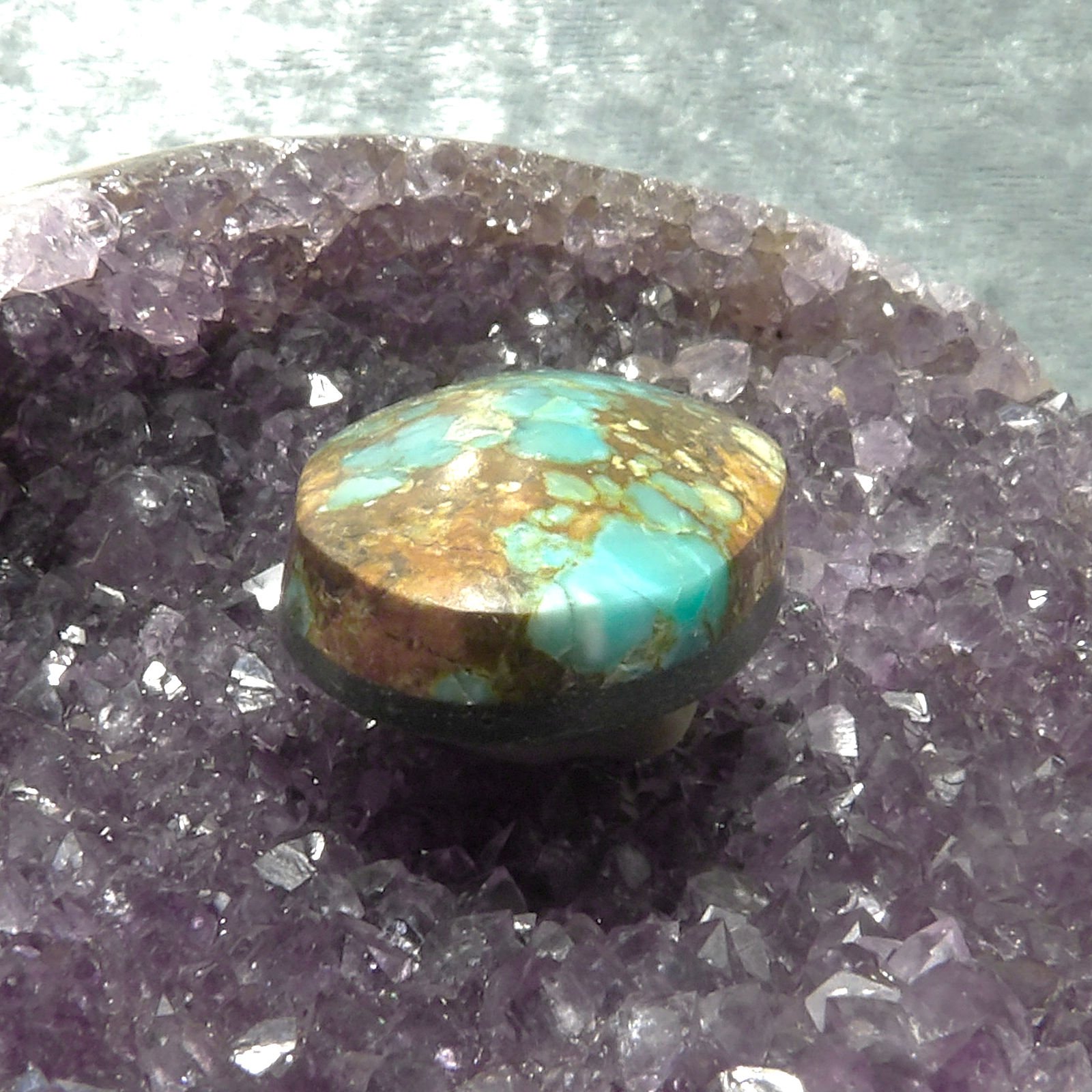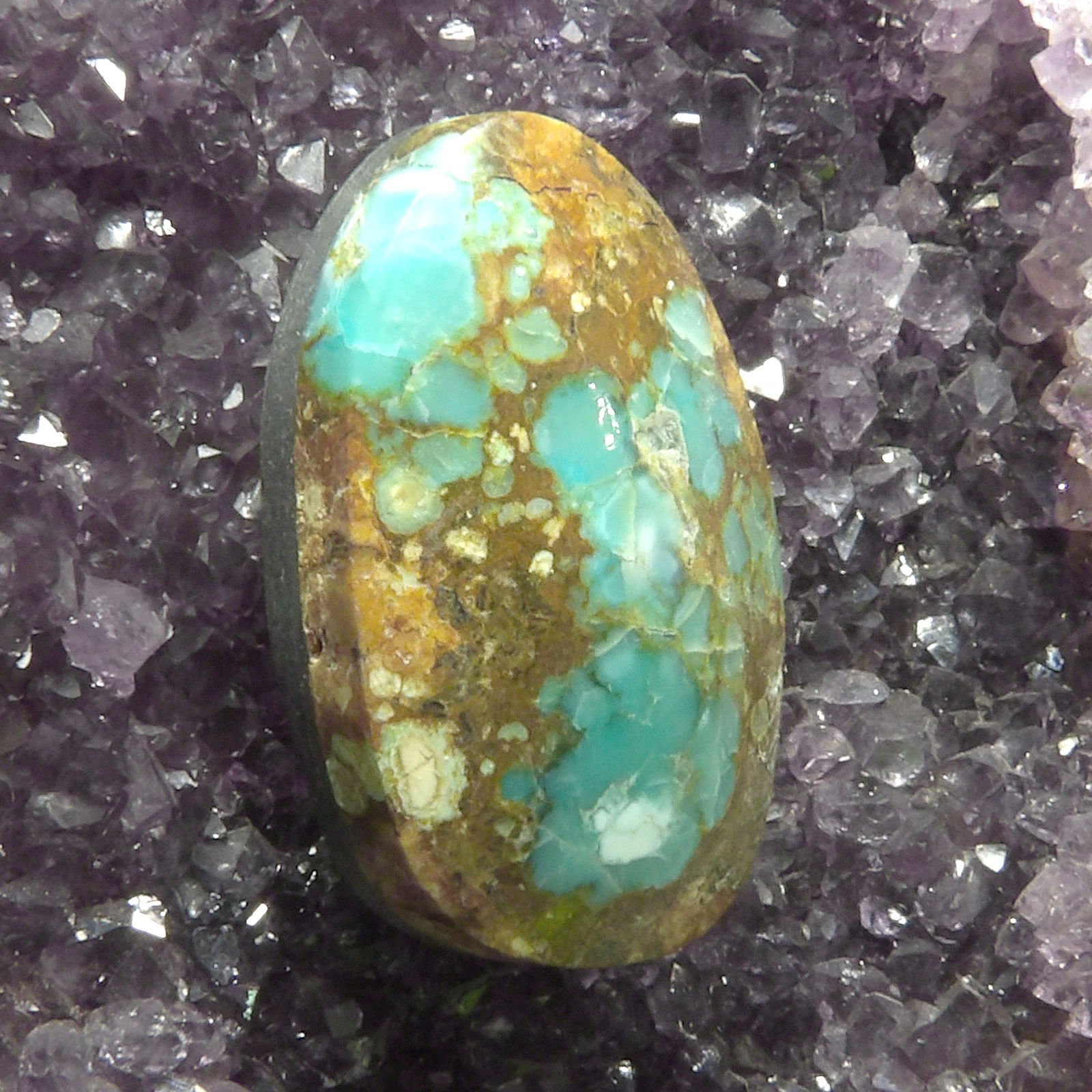 The distinctive matrix patterns in this Number 8 turquoise cabochon are a result of the surrounding host rock interacting with the mineral compounds during its formation.