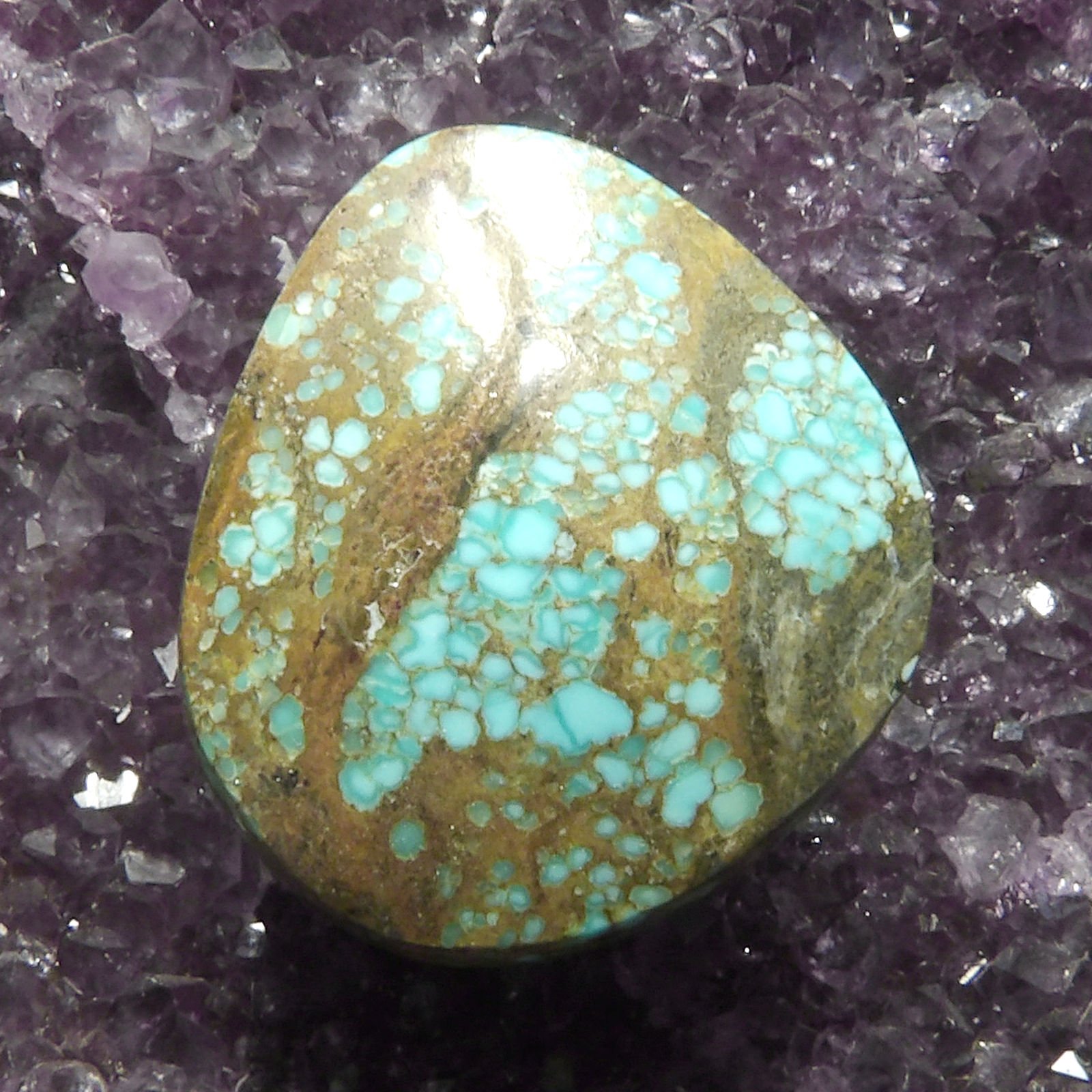 The distinctive matrix patterns in this Number 8 turquoise cabochon are a result of the surrounding host rock interacting with the mineral compounds during its formation.